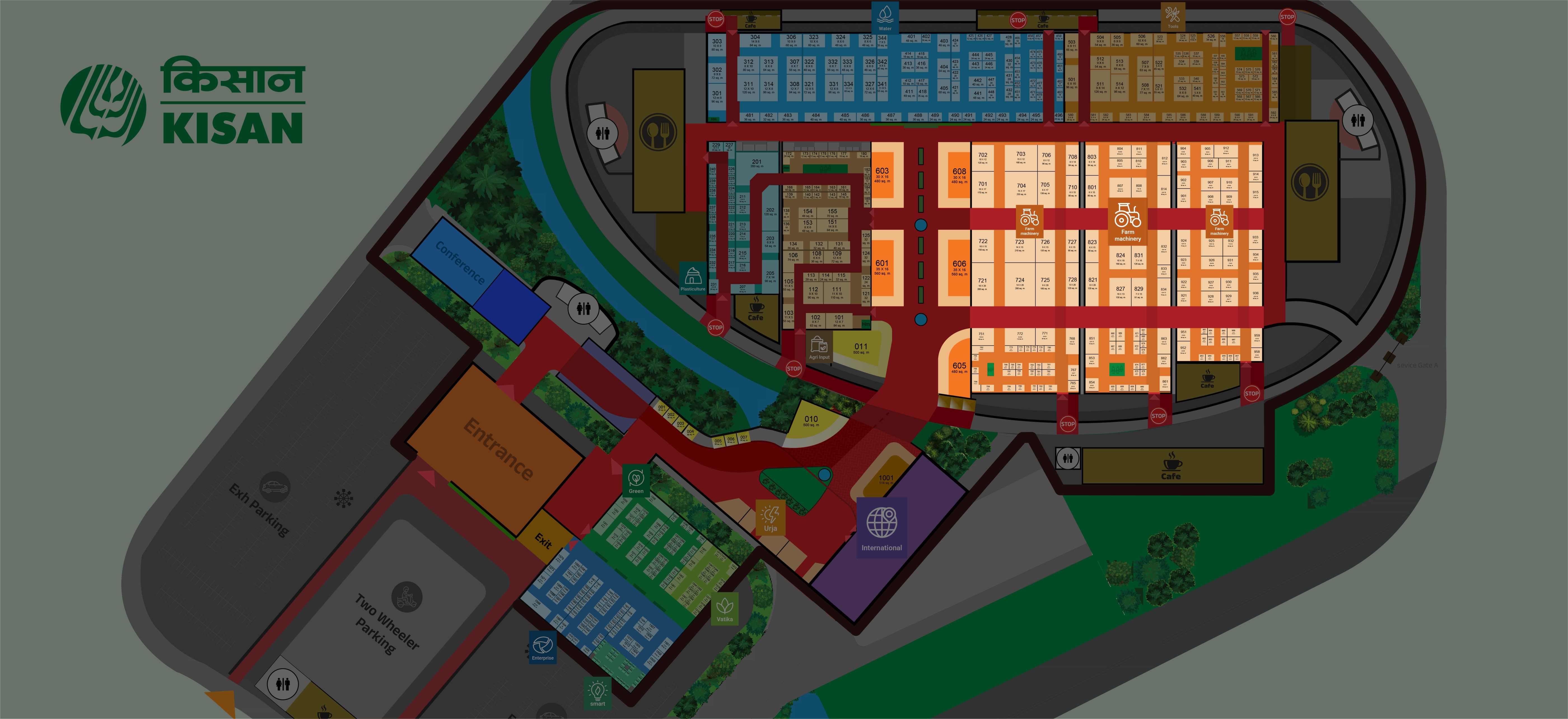 The arena showcases tractors, agricultural equipments and large machinery. It is covered by German Hanger from the top offering shade, visibility and adequate ventilation.